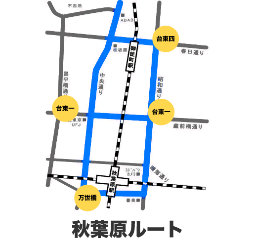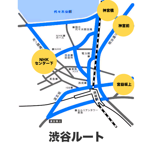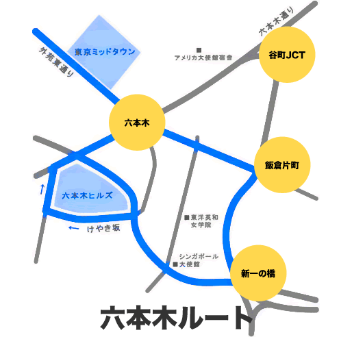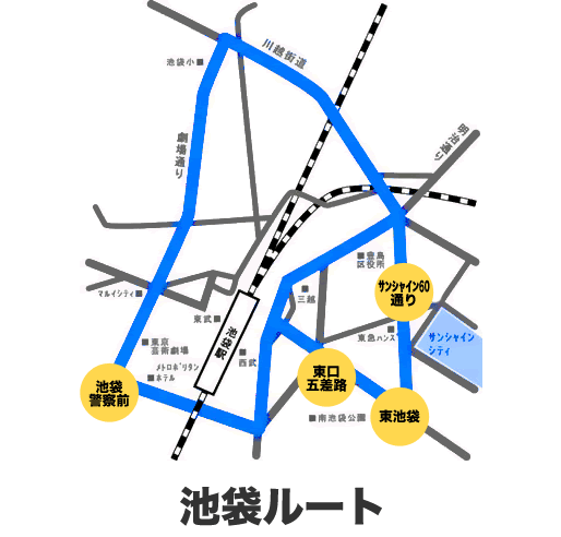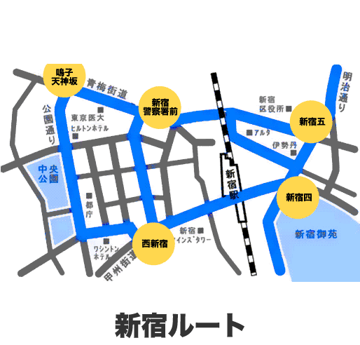 都内走行ルート例です。人通りの多いルートを無駄なく走行します。